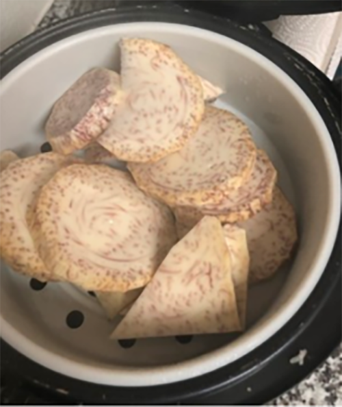 Step1:芋頭和糖和豬油的比例是1:0.2:0.3,如果不愛甜,適量少點糖。芋頭切片,切片是因為蒸的快,芋頭蒸的越軟越好,大概10-20分鐘。