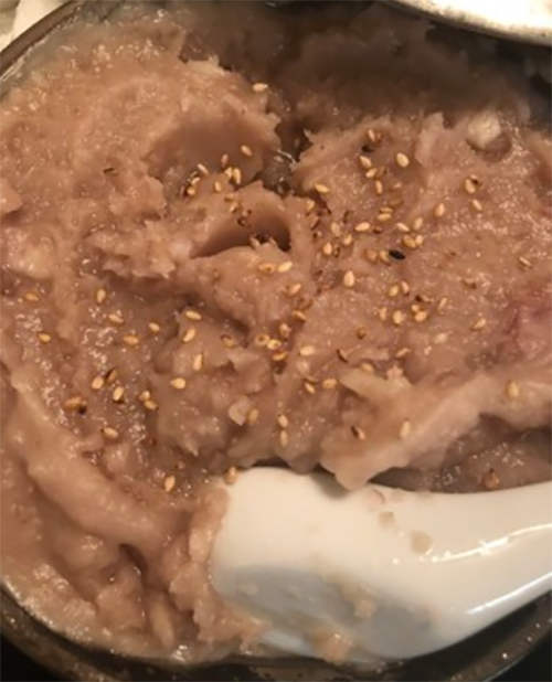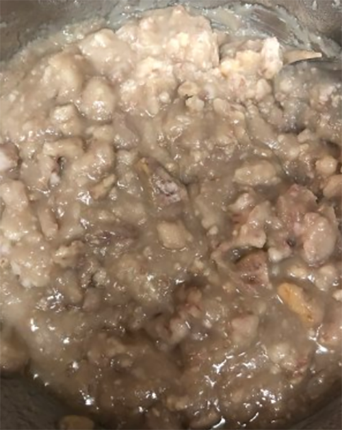 Step2:朝一個方向一直打到粘稠,也就是變成膠狀,加少量生粉,這個第一次最好慢慢來,先少加做一個嘗試下。粉多了,就會沒那么多魚味,口感也不好。粉太少又會太稀,包起來實在很困難。