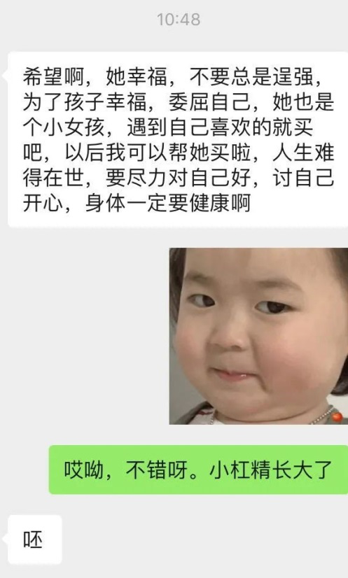 這一位是工作兢兢業業的同事,是兩個孩子的媽媽,一天多數時間都忙于工作。疫情原因孩子未去幼兒園,兩個孩子的養護就交給腰腿不好的母親。所以才有了下面這有自知之明的對話。
