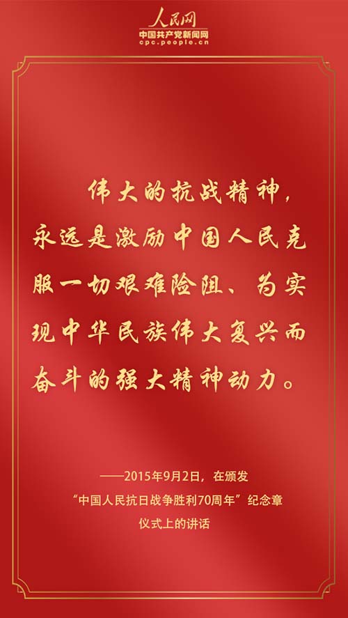 人無精神不立,國無精神不強。偉大的中國人民在抗日戰爭中創造的抗戰精神,是中國人民近代以來爭取獨立自由、實現民族解放的寶貴精神財富,總書記對此高度評價——