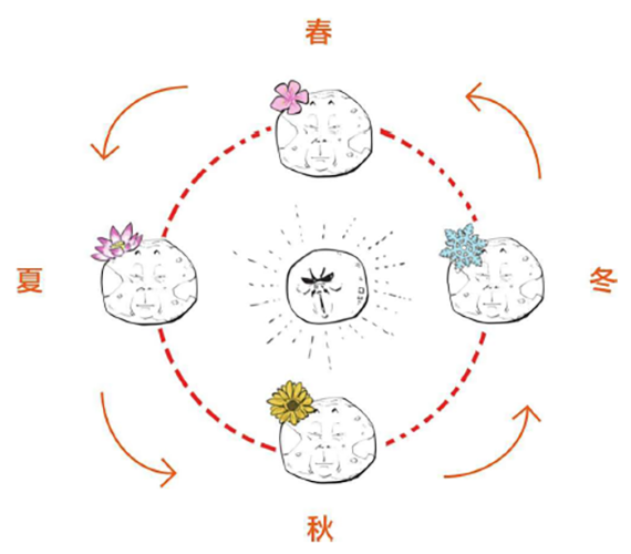 經歷了幾個月的浪漫時光,小芳懷孕了,老原不得不開始到處找吃的。可經過一場大雪,世界都禿了!他啥也找不著。老原恍然大悟:原來每過三個月就會換氣侯!一共四種氣候,每個循環要花12個月,于是就把這種循環叫作——一年。至此,日、月、年都有了,他又總結三者之間的規律,這形成了歷法。這個由月亮繞地球12個圈圈所組成的年叫做月亮年,老原開心的把這歷法傳給后代。老原的后代,上至結婚,下至私奔,都被這歷法安排得明明白白。