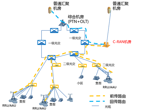 CRAN機房與OLT機房不重合,原有基站光纜網能滿足前傳需求。可利用原有基站光纜網作前傳,回傳可利用綜合業務區光纜。如下圖: