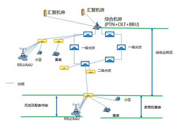 光纜融合方案從二級光交(含)到綜合機房的主干ODN部分由綜合業務區專業解決,無線配套傳輸解決從RRU/AAU到二級光交的部分,家寬和集客解決從用戶到二級光交部分。