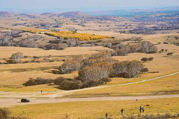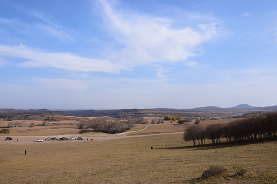 草原的10月已然是深秋了,牧民為了儲備冬天的牧草已經(jīng)早早將草打成垛運回了自家的倉庫,所以這個時候的草原,是灰黃的、光禿禿的一片,不過這并不妨礙游客們觀賞草原風景,灰黃的草原另有一番風味。
